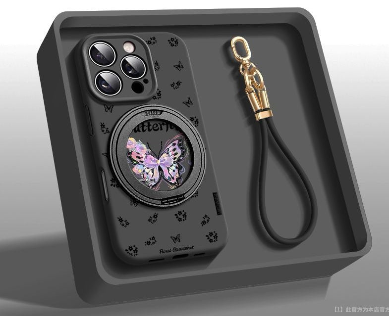 This phone case with a stand features 360-degree rotation,allowing adjustable positioning on a desk for convenient video viewing.It comes with a phone strap and an exquisite butterfly pattern design.