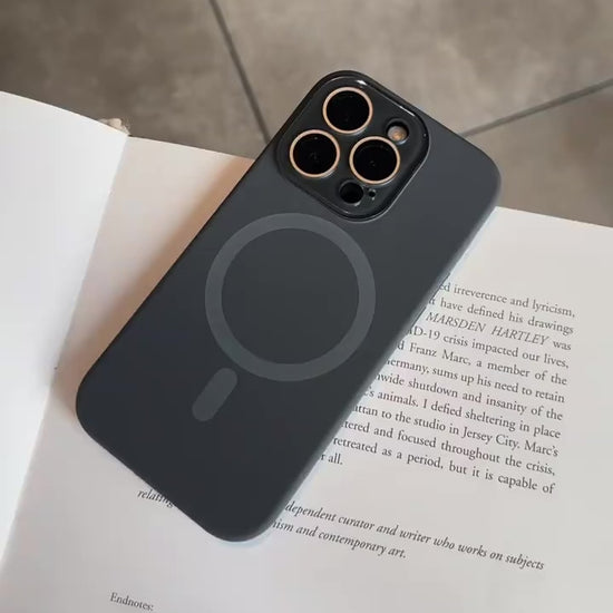 Black silicone iPhone case with MagSafe compatibility. Shock-resistant design protects your device while hard protection to the camera area. Sleek mesh detailing combines durability with style.Â